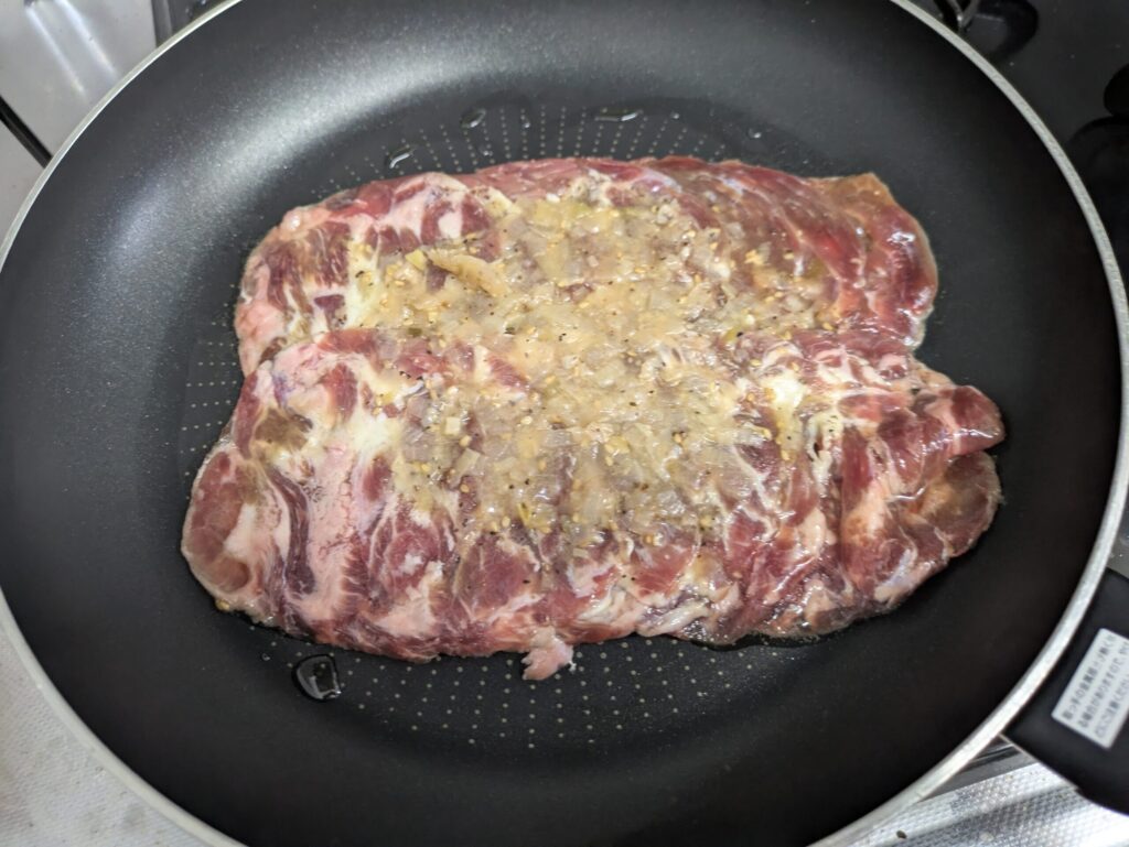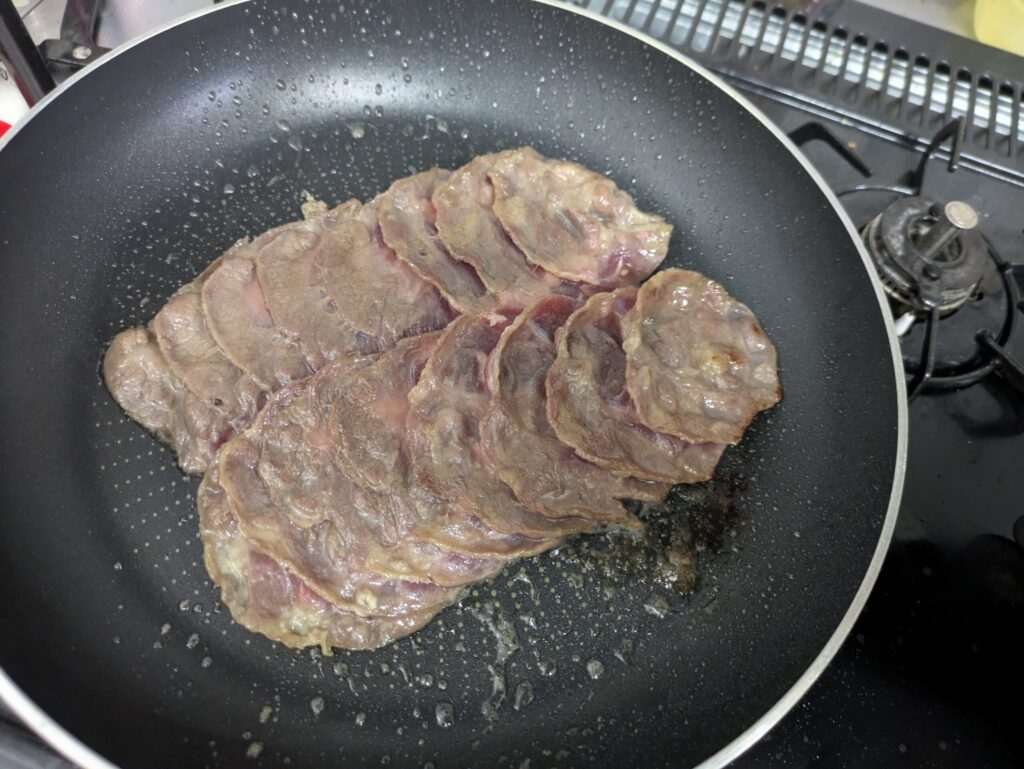 1.フライパンに解凍したネギ塩牛タンを並べて焼きます。ほぐさなくても最終的に火が通ります。