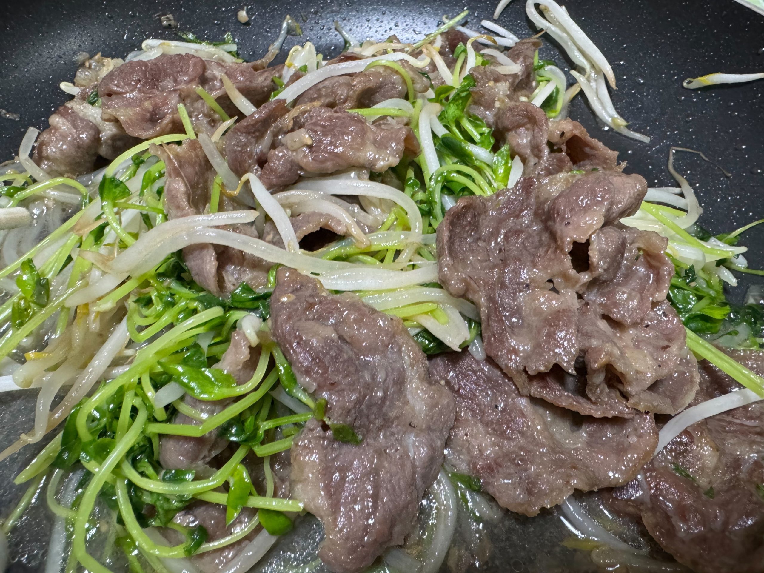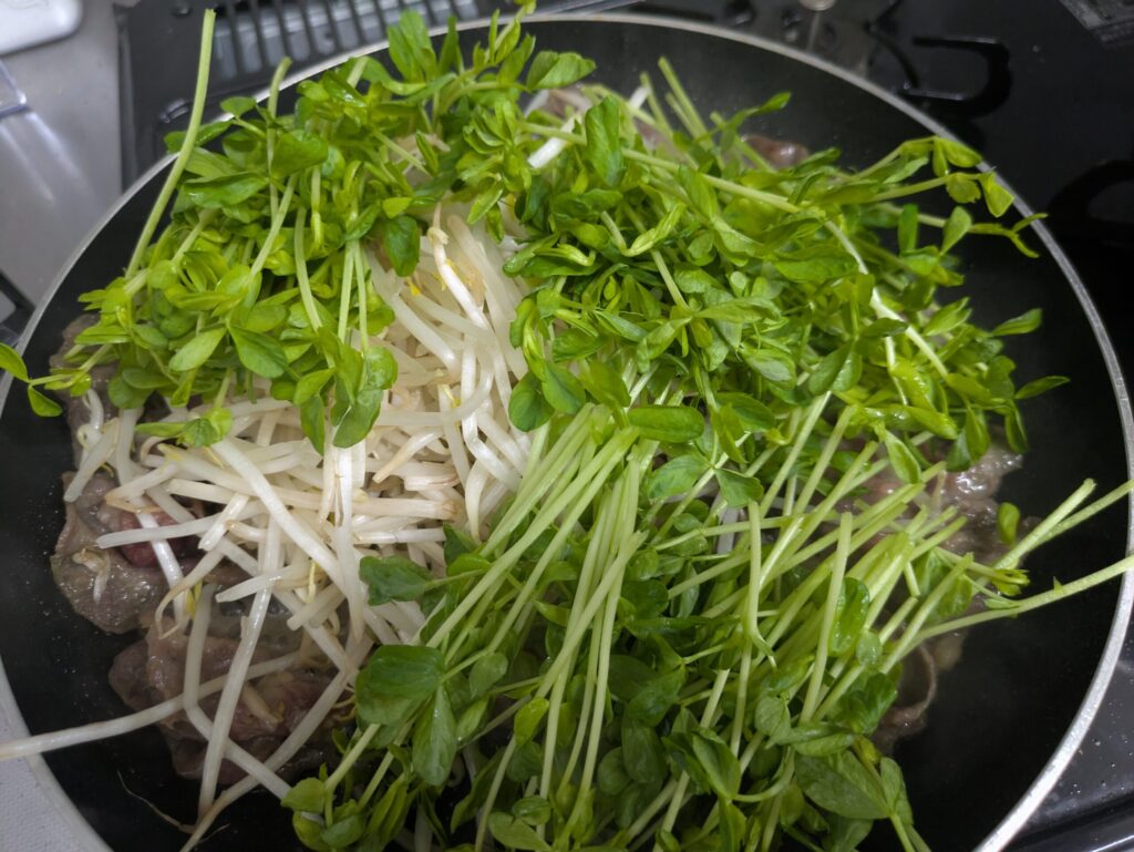 3.2分ほど焼いたら上にもやしと切った豆苗を重ね、蓋をして3分ほど蒸し焼きにします。